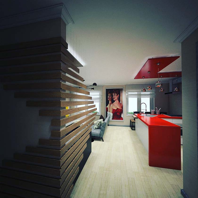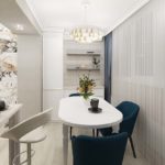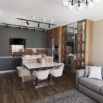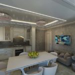 Немаловажное значение имеет размещение светильников. Здесь тоже есть много интересных решений. Например, над обеденной зоной можно установить основной источник света, а над рабочей — точечные светильники. Также можно использовать только софиты. А в случае двухуровневой конструкции отличным вариантом станет монтаж подсветки по периметру нижнего уровня и люстры по центру.